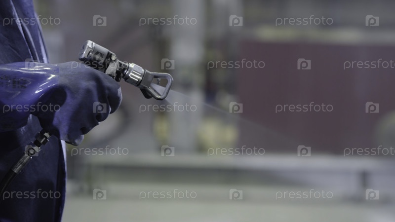 Рука, держащая пистолет промышленного размера, используемый для промышленных красок и покрытий