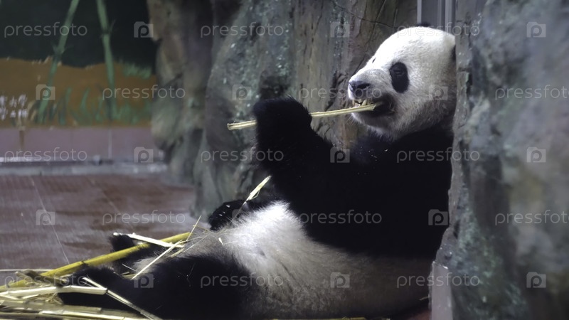 Панда ест бамбуковые стебли в зоопарке. СМИ. Чубби-панда сидит лениво и любит есть бамбук - крепкие зубы в зоопарке. Растительная пища из бамбуковых стеблей панды