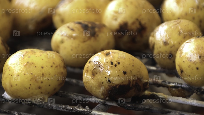 Жареные колбасы, жаренные картофель на гриле