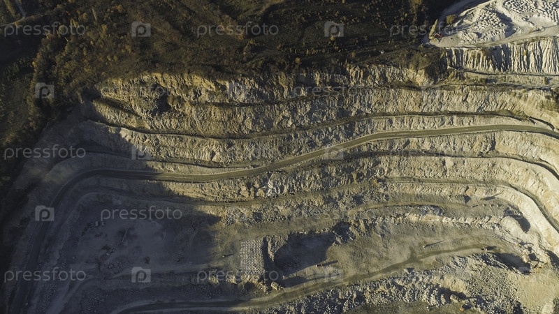 Панорамный вид на карьер.Снимать.Вид живописного карьера, расположенного на прибрежной горе недалеко от деревни в лесу.Концепция добычи