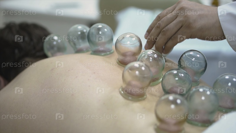 Массаж вакуумных банков. Закрытие человека, лежащего с банками на спине в спа-салоне. Вакуумные банки при лечении и косметологии