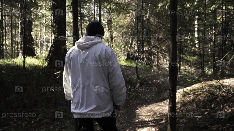 Человек идет по тропинке в лесу. Кадры. Взгляд назад на одинокого человека. Концепция активного отдыха в природе