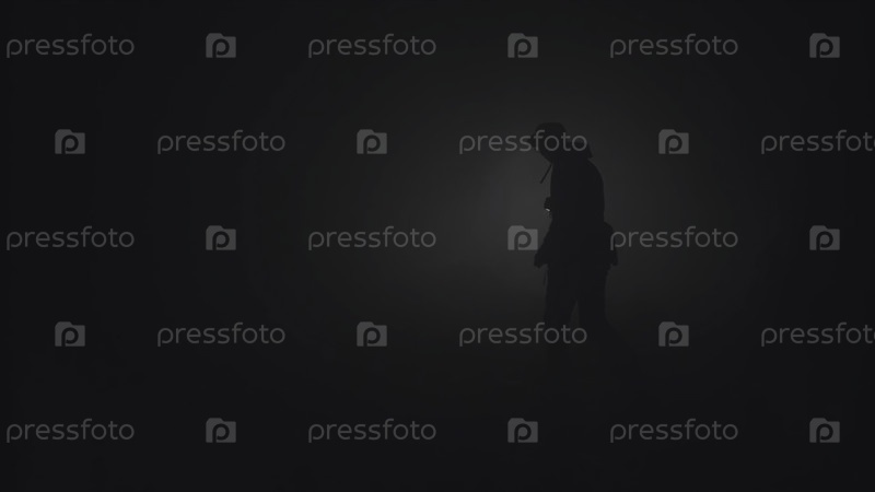 Силуэт мужчины в густом тумане. Резервные кадры. Черный силуэт человека с фонариком, светящимся в густом сером дыме. Мужчина со фонариком проникает сквозь темноту в дыму