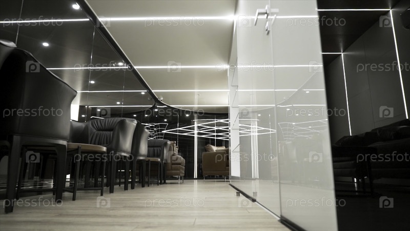 Вид на роскошный современный ресторан с деловыми столами и кожаными стульями в бело-черном глянцевом интерьере