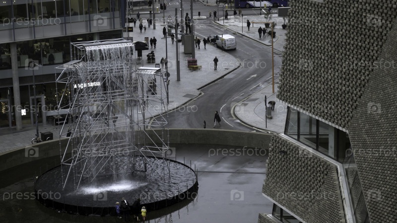 Красивая современная архитектура бизнес-небоскребов с фонтаном.Продолжайте.Архитектура современных небоскребов и ландшафт с фонтаном в пасмурную погоду