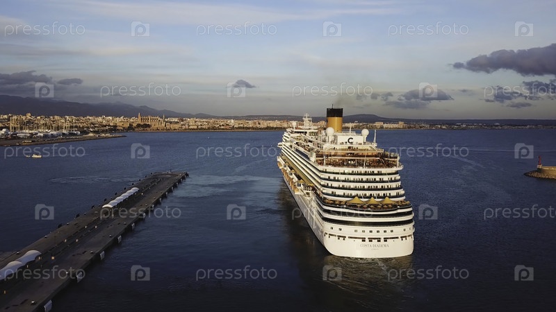 Круизный корабль в гавани. Сток. Вид с воздуха на красивое большое белое судно при закате солнца. Красочный пейзаж с лодками в заливе Марина, море, красочное небо. Вид из дрона корабля. Роскошный круиз