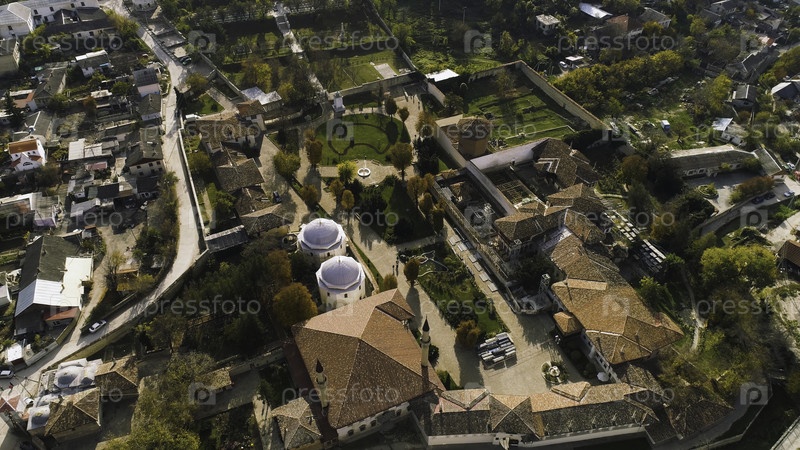 Вид на небольшой зеленый частный парк в городе. Снимайте. Красочный старый город расположен в уединенном районе, окруженном горами