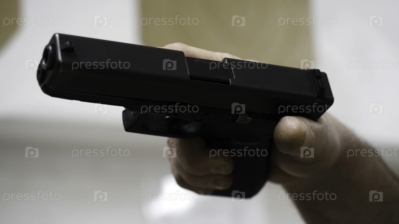 Оружие в руке мужчины. Человек на близком расстоянии. Черный пистолет в руке человека
