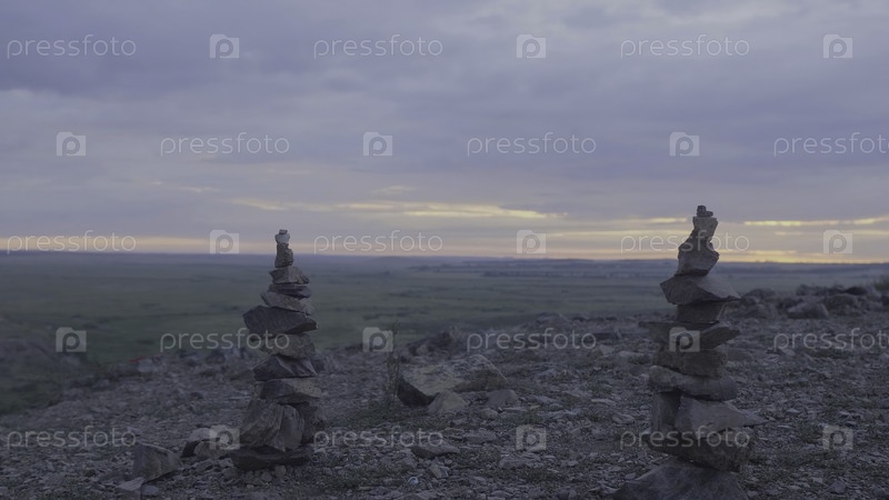 Песчаные камни Зенская башня и баланс. кучка камней против неба. каменная башня на фоне поля и утреннего неба