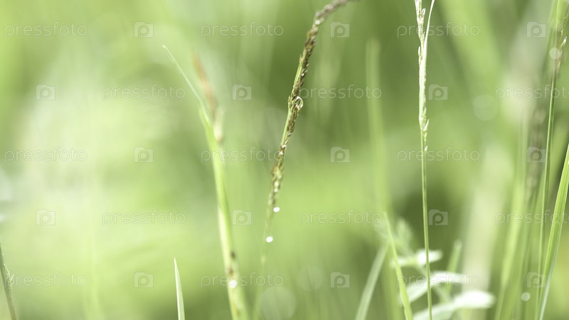 Покрыть небольшую каплю утренней росы на зеленой траве. резервные кадры. естественный пейзаж летнего зелёного луга с каплей воды на траве