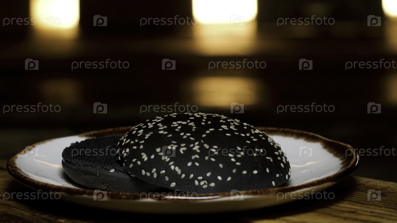 Закройте черный хлеб с кунжутными семенами, лежащим на тарелке на деревянном столе