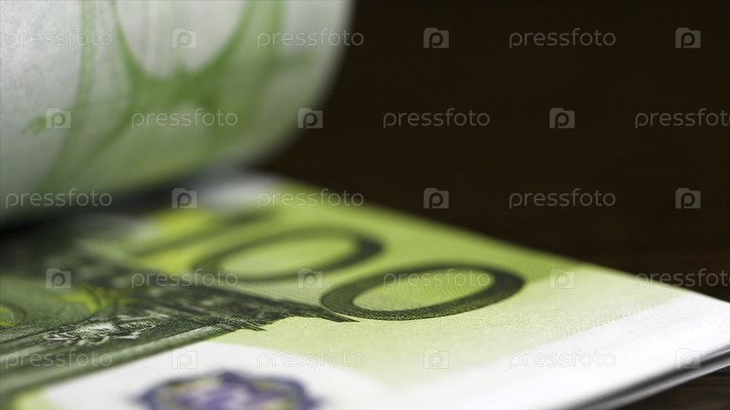 Стоевровые банкноты в ближайшем плане. Евробанкноты считаются на черном фоне. Евробанкноты падают на деревянный стол. Понятие денег