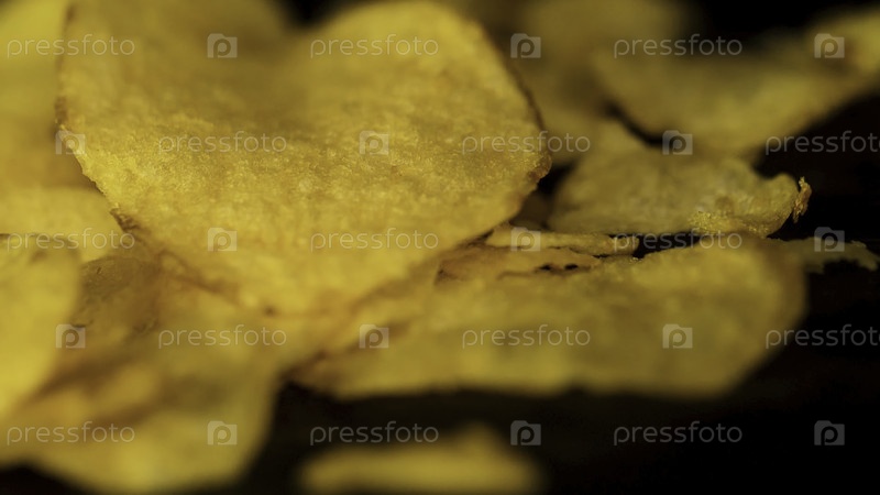 Поворачивающиеся чипсы близко, макроскопия пищевого фона. Близкий план желтых вкусных чипсов, случайно лежащих на столе. Вкусные картофельные чипсы. Картофельные чипсы, ближайший