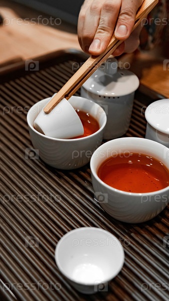 Церемония чайной вечеринки - изысканный традиционный процесс выливания с использованием элегантного крокера