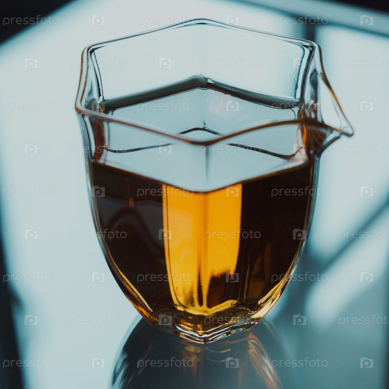 Стильный стеклянный кувшин, заполненный яркой янтарной жидкостью, которая прекрасно выделяется