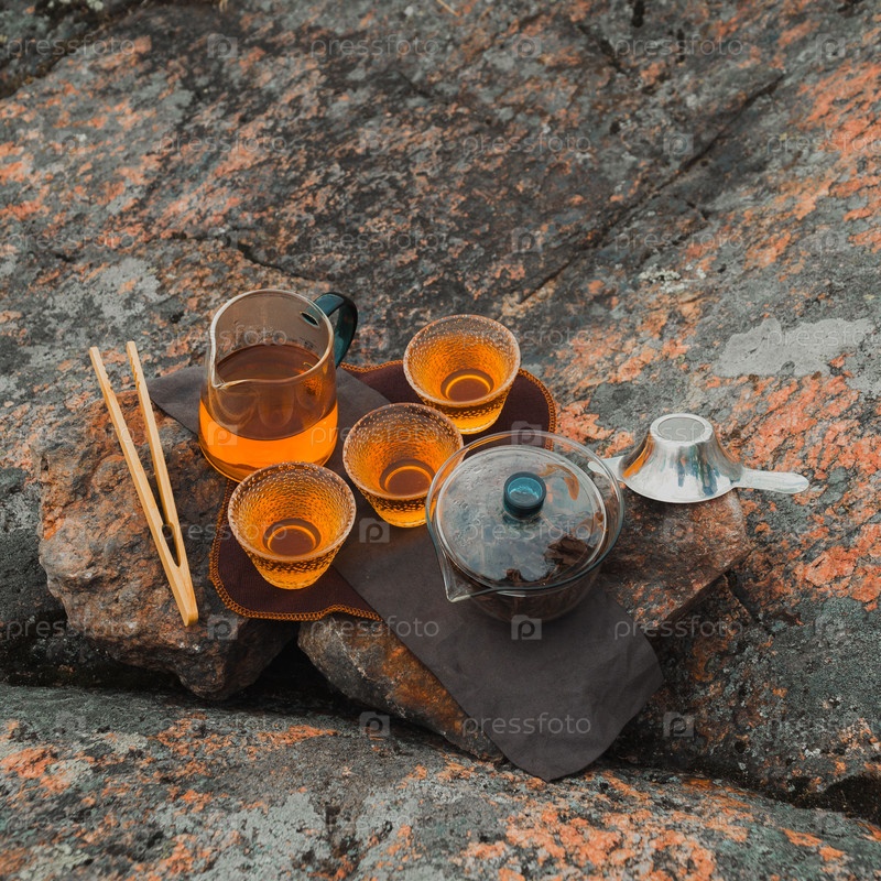 Спокойное чайное растение с чашками и горшком на каменистом фоне, идеально подходит для релаксации и естественных вибраций