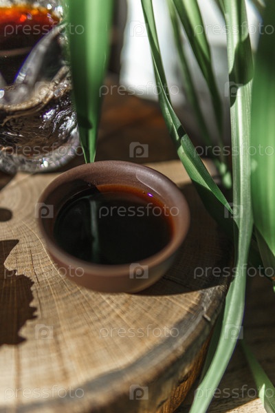 Красивый вид показывает темный сироп в глиняной чашке, окруженную зеленью и текстурами, создавая захватывающую сцену
