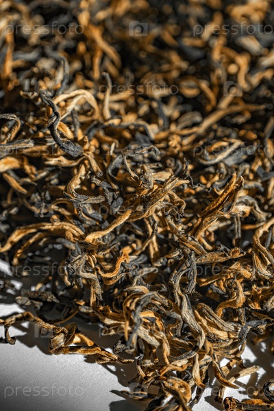 Близкий взгляд на сушеный, свободный листовой чай, подчеркивая его сложные текстуры и красивые оттенки в деталях