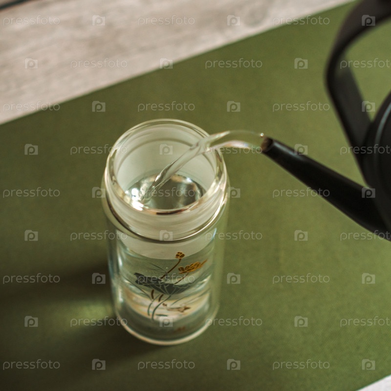 Красиво спроектированный и изготовленный стеклянный чайник элегантно наливает горячую воду в бутылку с цветами