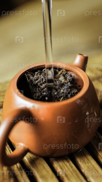 Спокойный и спокойный момент заваривания чая, когда горячая вода медленно сливается в красивый глиняной чайник