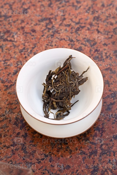 Сушеные листья зеленого чая помещаются в белую керамику для красивой презентации