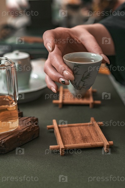 Успокаивающая и безмятежная чайная церемония демонстрирует деликатные фарфоровые чашки для чая, элегантно сочетающиеся с бамбуковыми стойками