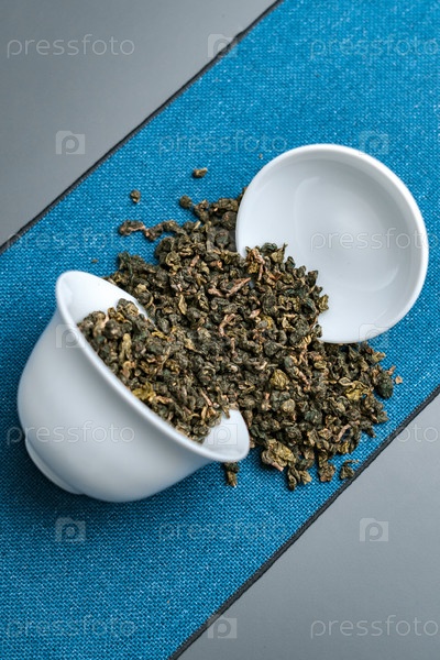 Эстетически приятный вид, показывающий свободный листовой зеленый чай, грациозно наливающийся из элегантной чаши