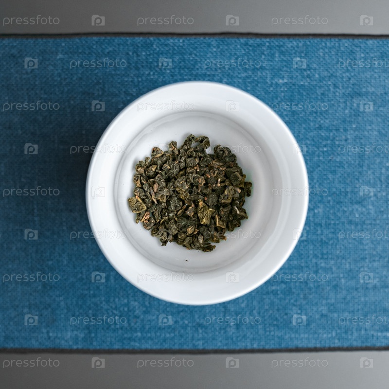 Близкий план сушеных листьев зеленого чая красиво расположен в миске, установленной на ярко-синем фоне ткани