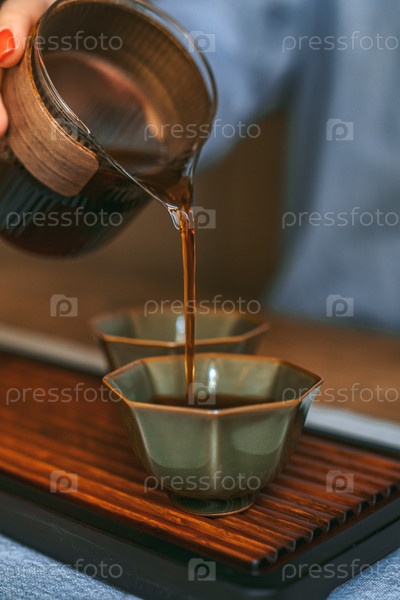 Спокойный момент наливания ароматического чая в нежные кружки, символизирующий спокойствие и глубоко укоренившиеся традиции