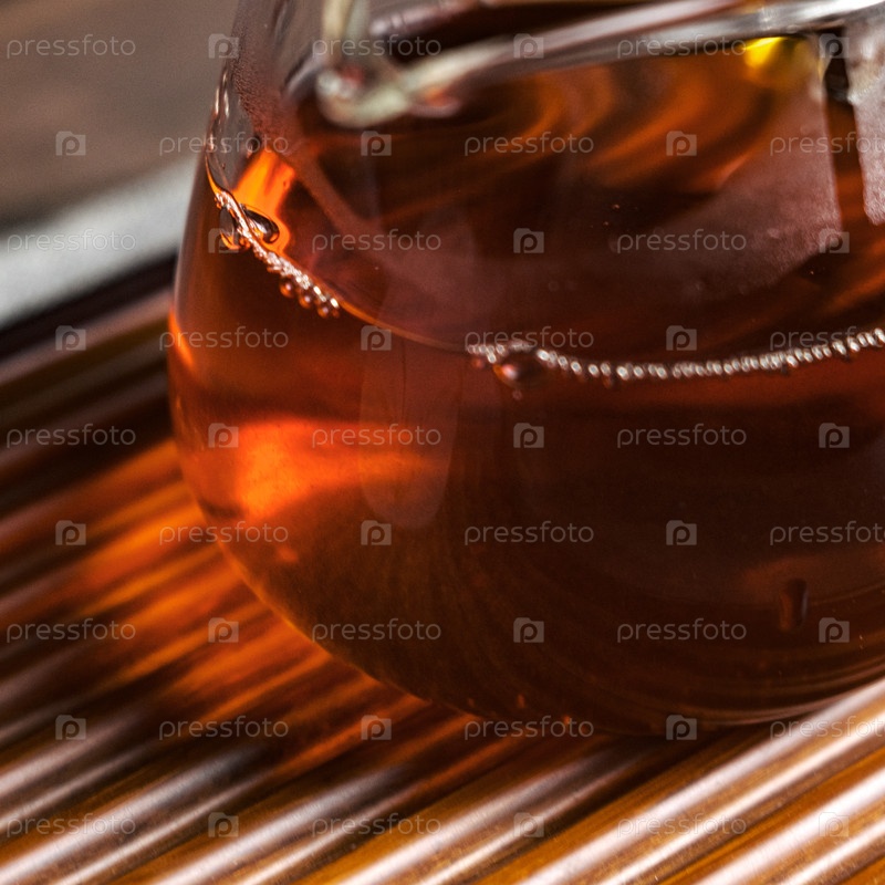 Близкий план теплой янтарной жидкости в стакане на деревенском столе вызывает ощущение комфорта и спокойствия