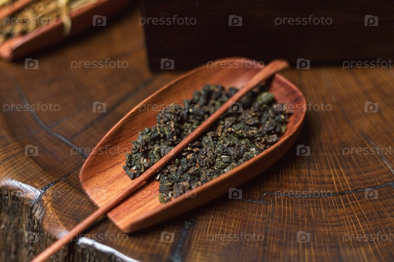 Красиво устроенный дисплей изысканных листьев травяного чая, элегантно расположенных на деревянной подносе