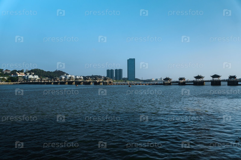Современная линия горизонта появляется над спокойными водами с красивыми мостами
