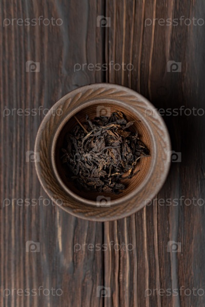 Близкий снимок сушеных листьев черного чая, красиво расположенных в декоративной миске на деревянной поверхности