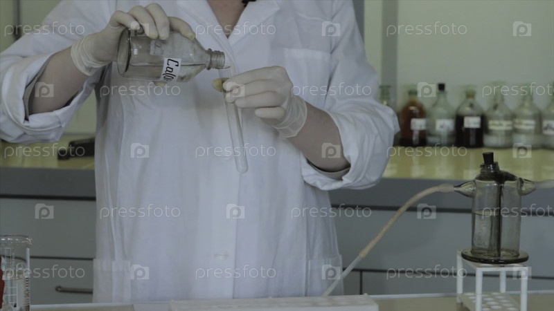 Ученый разливает химические вещества в лаборатории.Техник смешивает колбу с реагентами.Техник добавляет реактивы к колбе