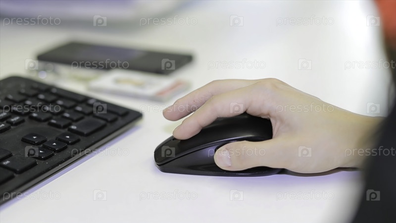 Женская рука использует беспроводную мышь на белом столе. Закройте портрет молодой женщины рукой с помощью компьютера