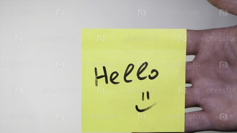 Наклейка со словами 'Привет на стекле'.Привет - записка на бумаге, бизнес-концепция