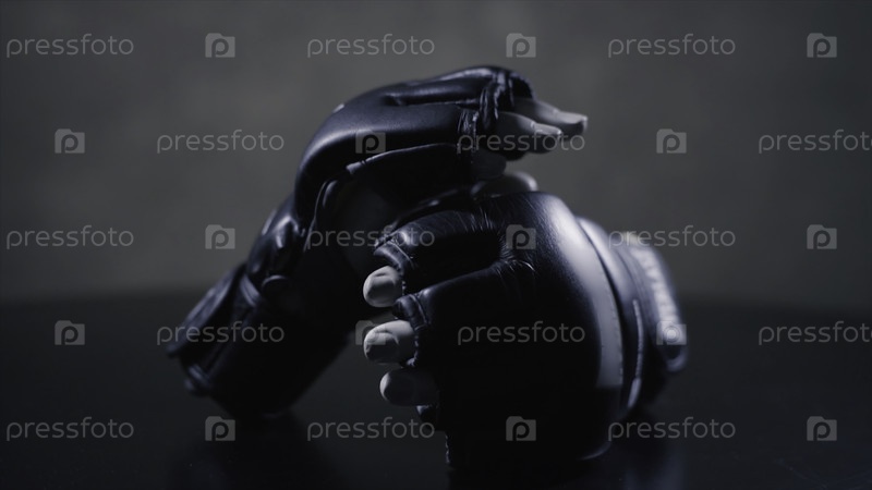 Перчатки для боевых искусств Fist Black, мм. Пара перчаток для бокса на столе.Концептуальный образ, идея ожесточенной конкуренции