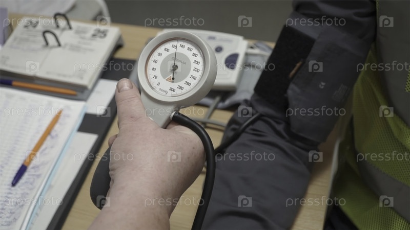 Закройте кабинет врача, который измеряет давление пациента.Клип.Врач проверяет кровяное давление у молодого человека.Измерение пульса для пациента