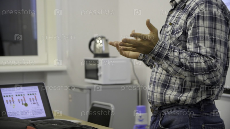 Неформально одетый старший профессор выступает на научной конференции.Публика находится в конференц-зале.Научные эксперты и деловые мероприятия p