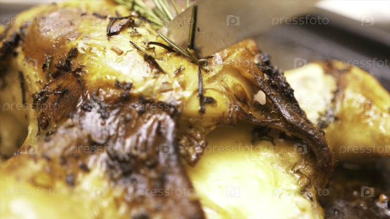 Покройте вкусную цельную жареную курицу хрустящей корой.Разрежьте приготовленную и запеченную вкусную курицу с розмарином кухонным ножом