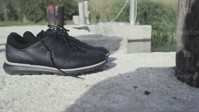 Обувная блокада против босоногих мужчин.Сток.Человек снял обувь и пошел в воду босиком.Жаркий летний день для купания