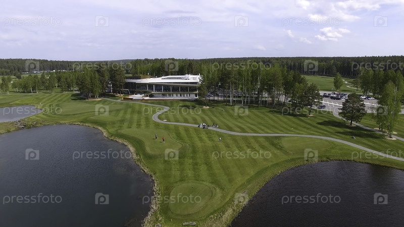 Поле для гольфа в солнечный день, отличный голф-клуб с прудами и зеленой травой, вид на небо