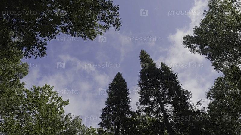Зеленый лес. Дерево с зелеными листьями внизу является фоновым видом. Вид на высокие старые деревья в вечнозелёном первичном лесу. Голубое небо на заднем плане