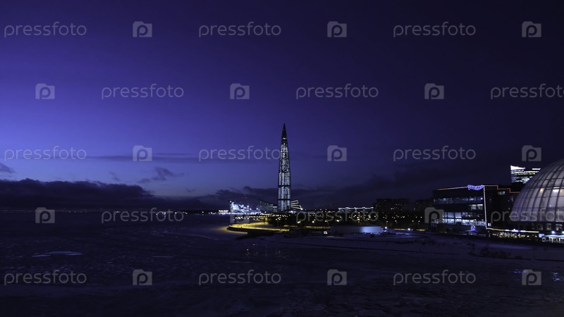 Вид на небоскреб, покрытый фонарями в современном городе ночью Концепция Зимний городской пейзаж современного небоскреба ночью