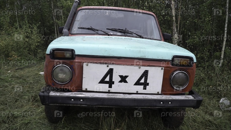 Москва, Россия - сентябрь 2018: внедорожник на фоне русского пейзажа Клип. Вид российских внедорожников. Концепция вождения в непроходимых районах природы