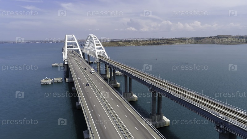Вид на подвесный мост над водой.Стреляйте.Автомобили ездят по белому подвесному мосту через голубую воду.Прекрасный морской пейзаж с Крымским подвесным мостом