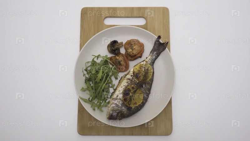 Выпечённая рыба с лимоном и пряностями в ресторане.Давайте.Прекрасно подаваемая рыба в ресторане на белом фоне.Простая элегантная порция выпеченной рыбы на белой тарелке