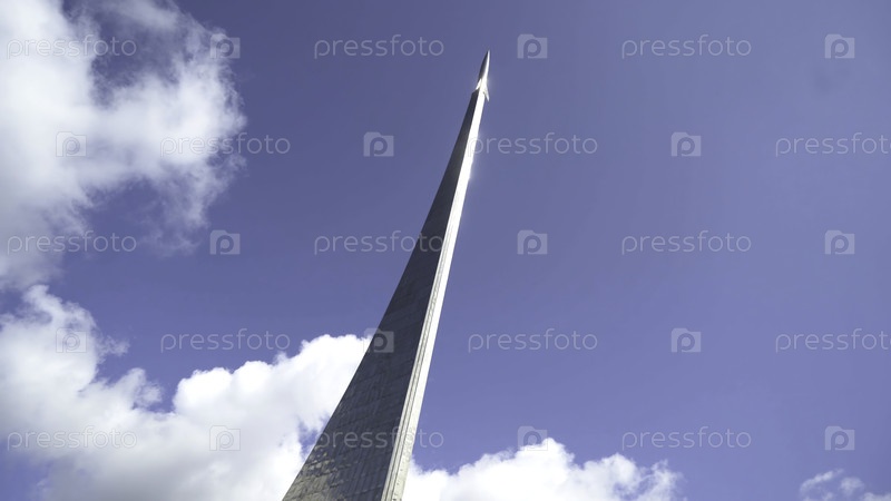 Москва, Россия - Май 2019: Вид на мемориал ракеты на фоне синего неба. Продолжайте. Красивый знаменитый памятник ракете в музее космонавтики против неба