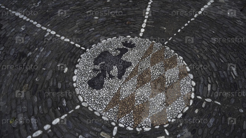 Близкая мозаика из булыжника, черный орел с короной и красными бриллиантами