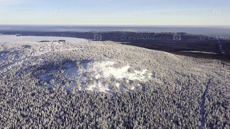 Зимний пейзаж горной местности с густым хвойным лесом, покрытым снегом и туманным горизонтом с голубым небом